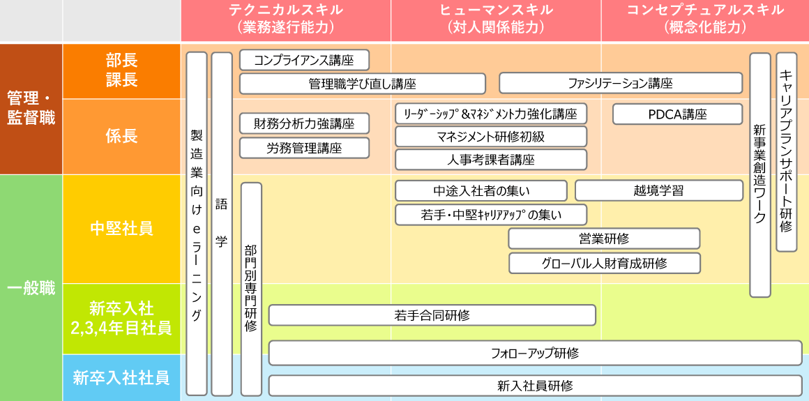 当社では、入社直後の新入社員研修から若手期のフォローアップ研修までを一つの成長ストーリーとして設計し、キャリア形成を継続的に支援しています。